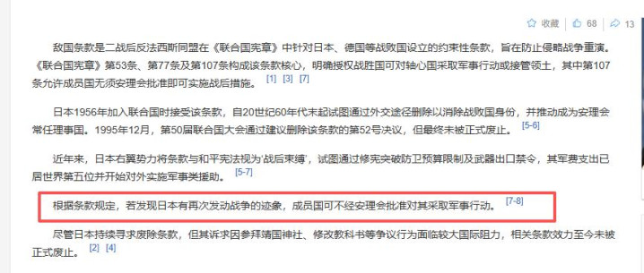 要知道的是,根据敌国条款,一旦发现日本有再次侵略的迹象,二战战胜国中国以及俄罗斯,是可以不经安理会批准,直接对日本动武,所以俄罗斯的这句话也是在警告日本,再不老实,中俄都有理由消灭你。